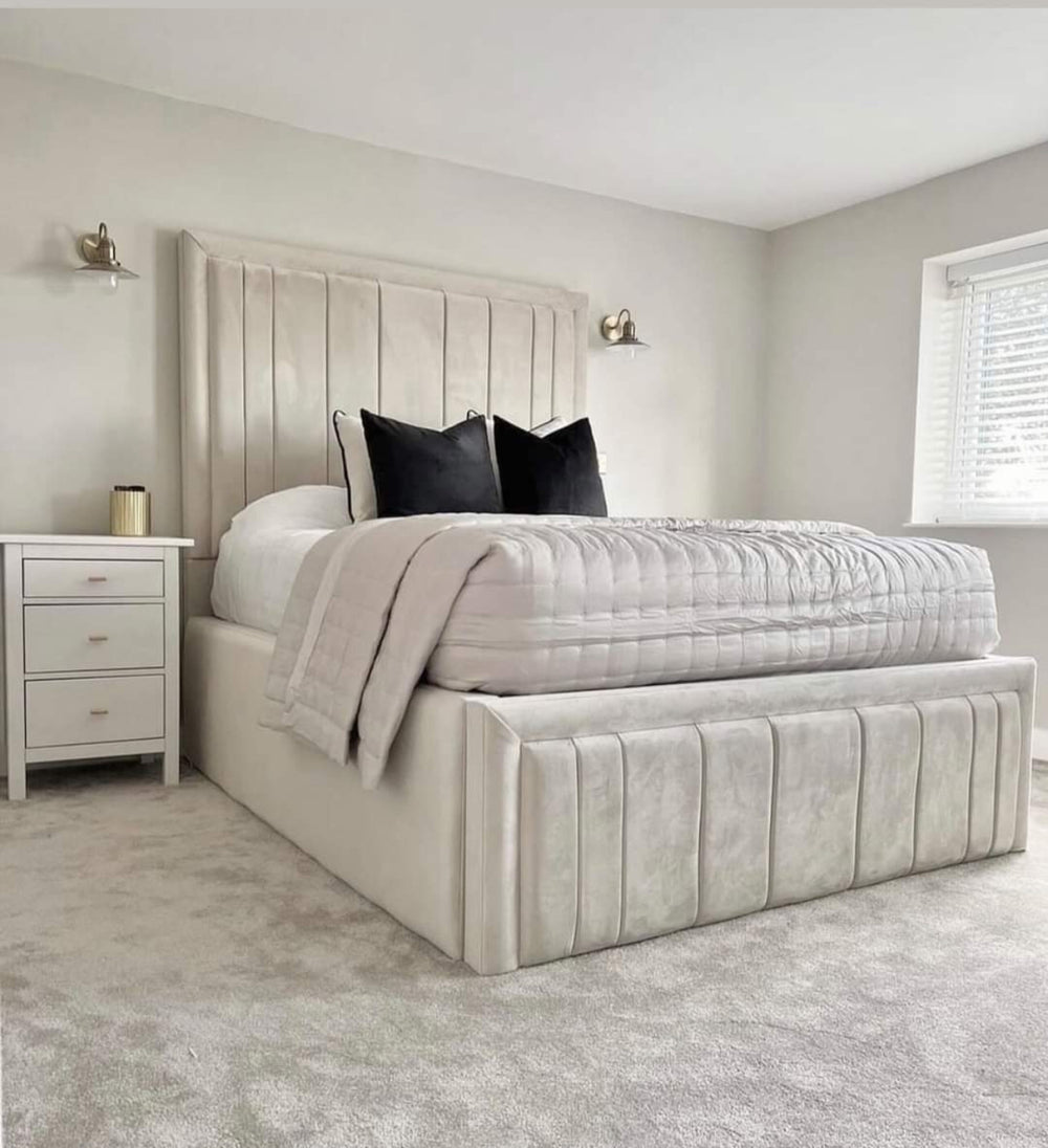 Elevate your bedroom with the refined elegance of the MONTREAL Bed — a modern masterpiece designed to transform your space into a luxurious retreat. This bed features a sleek, floor-standing headboard with clean, straight-cut panels, expertly upholstered for a contemporary look and feel. Complemented by a matching panelled footboard, the MONTREAL combines bold style with understated sophistication, making it a standout centerpiece in any bedroom.