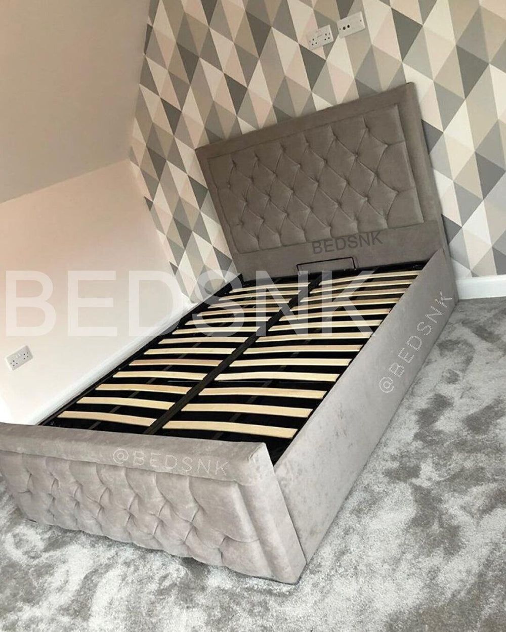 The slatted Ottoman Storage option is also gas lift up storage under the bed. However the storage is not in 2 compartments. It comes with 2 lids to store your items and belongings on. The lids are optional and can be removed so items can be stored on the floor/carpet. The mattress sits on a frame made of metal and sprung slats.