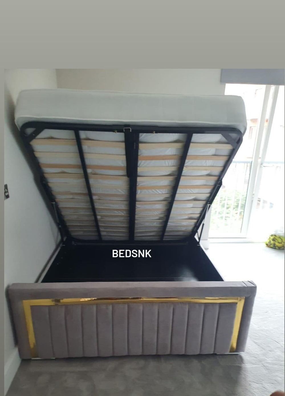 The slatted Ottoman Storage option is also gas lift up storage under the bed. However the storage is not in 2 compartments. It comes with 2 lids to store your items and belongings on. The lids are optional and can be removed so items can be stored on the floor/carpet. The mattress sits on a frame made of metal and sprung slats.