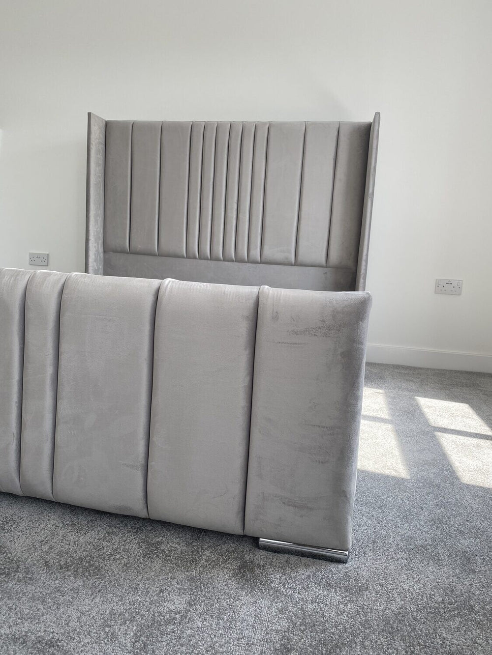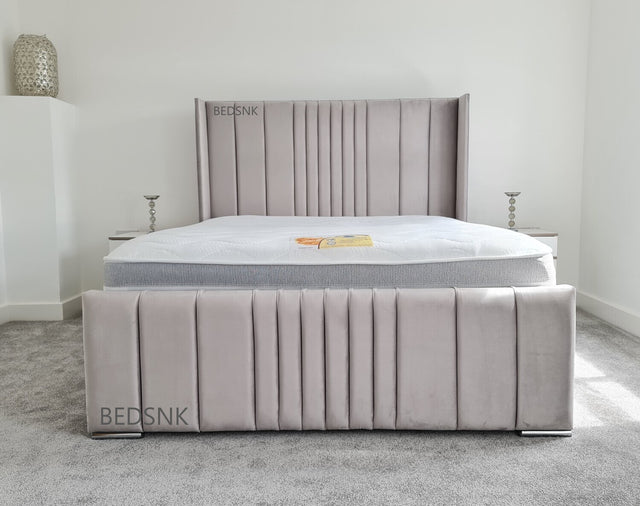 Bring contemporary style to your bedroom with the Kensington bed frame. Featuring a winged headboard with designed padded panels this piece is perfect for adding a modern touch to any neutral space. Its versatile design makes it easy to style with any colour or décor. Complete with an impressive headboard and matching footboard, the Kensington will make a statement in any bedroom.