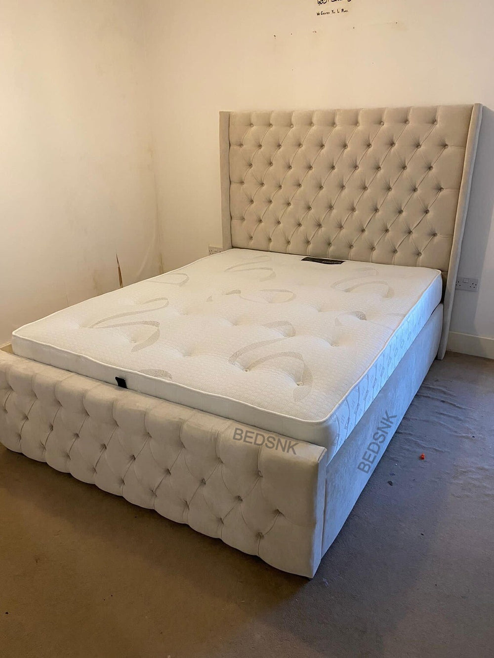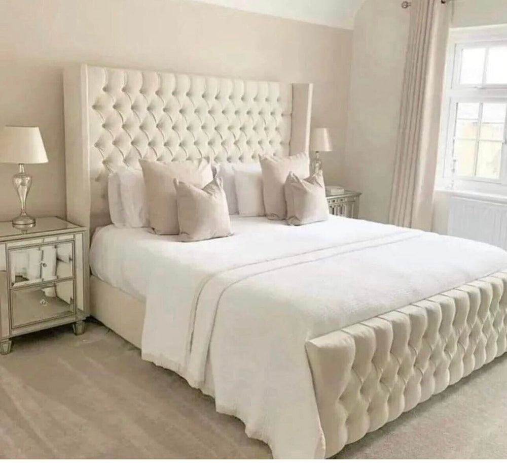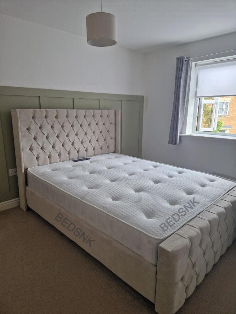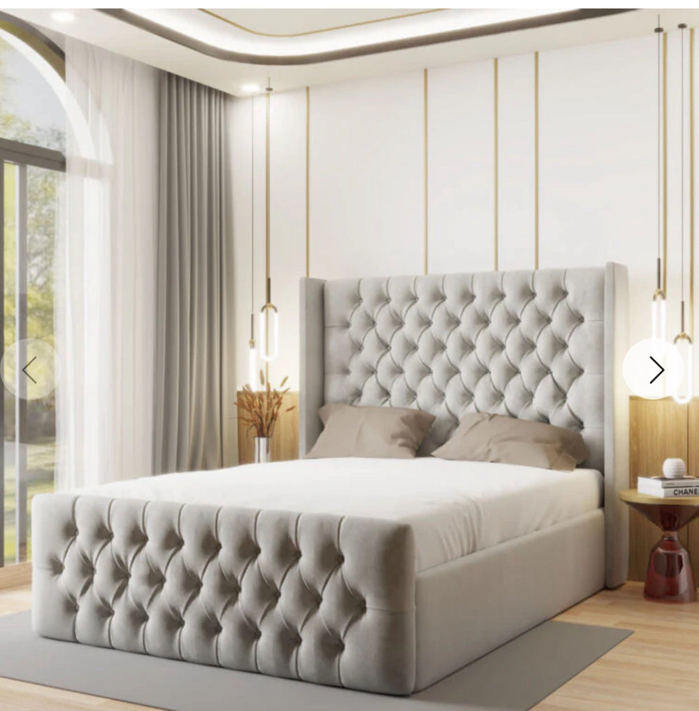 Indulge in timeless elegance with the luxurious Manhattan Bed Frame. Crafted with a sumptuous winged buttoned headboard handmade with Spanish upholstery, this exquisite frame will make a stunning centre piece for your bedroom sanctuary. Transform any room into a haven of luxury .