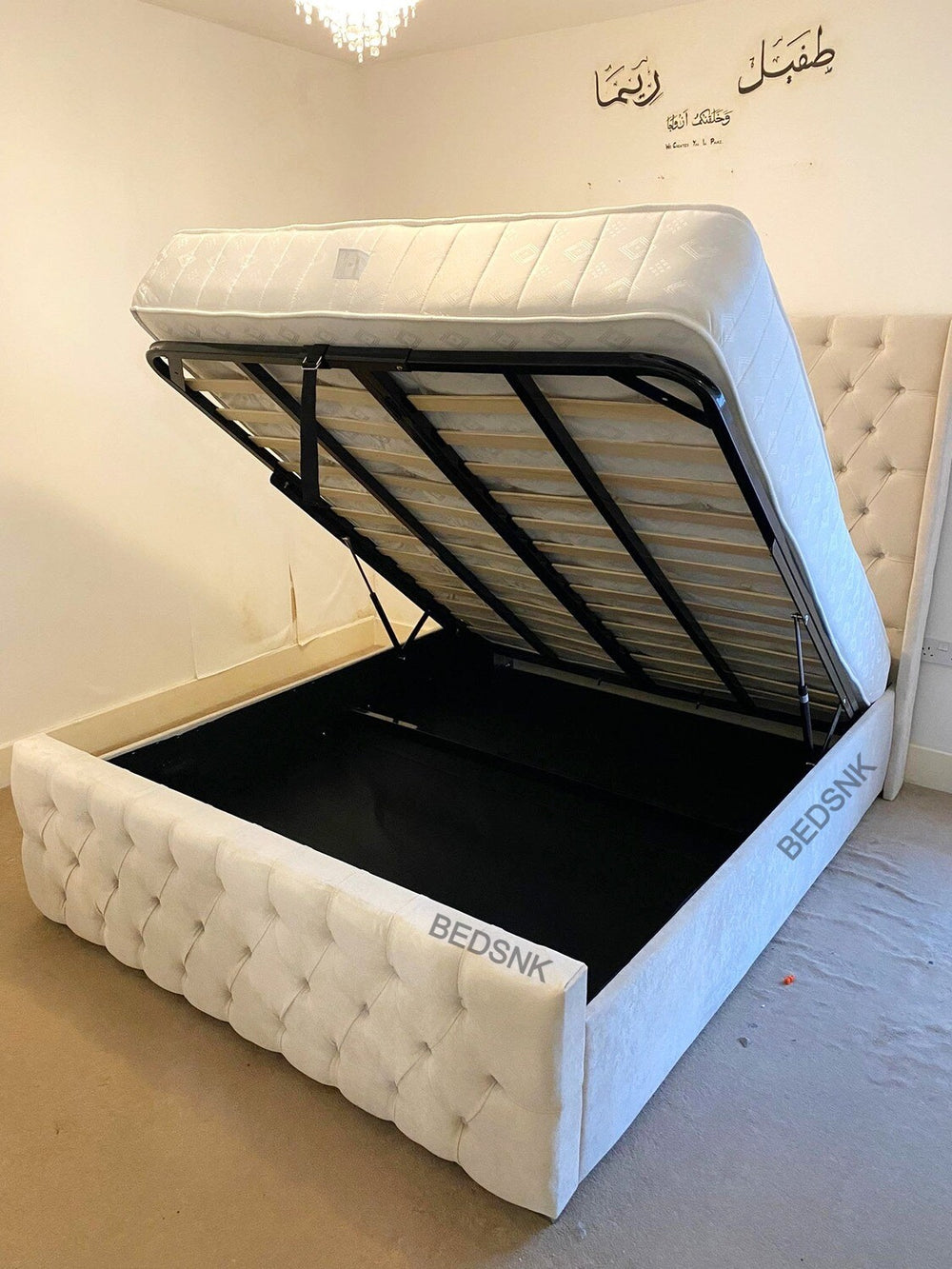 The divan ottoman storage option is gas lift up storage under the bed. Thewooden storage base is split which comes in two compartments.