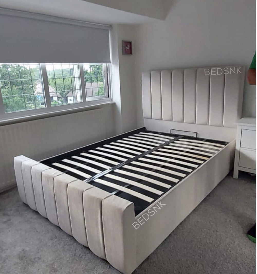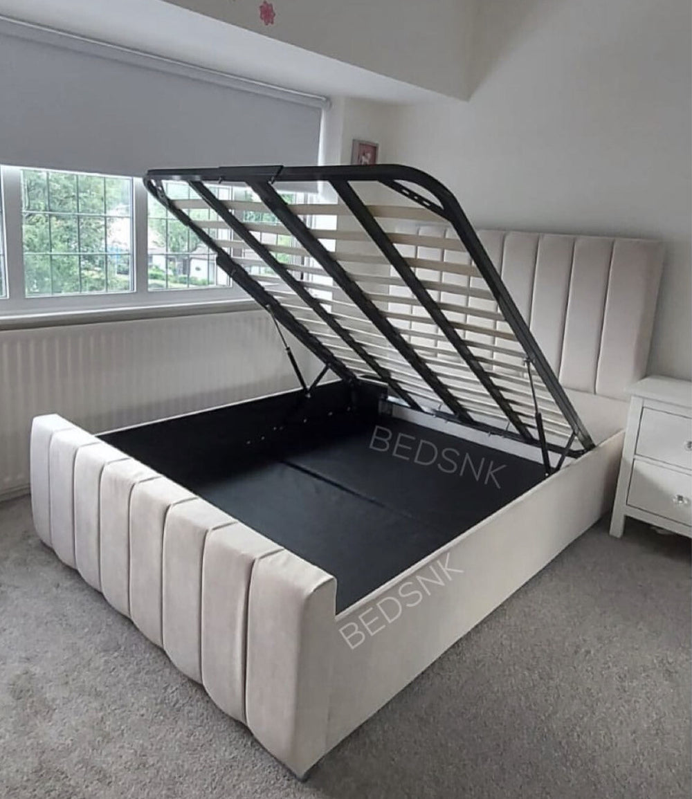 The slatted Ottoman Storage option is also gas lift up storage under the bed. However the storage is not in 2 compartments. It comes with 2 lids to store your items and belongings on. The lids are optional and can be removed so items can be stored on the floor/carpet. The mattress sits on a frame made of metal and sprung slats.